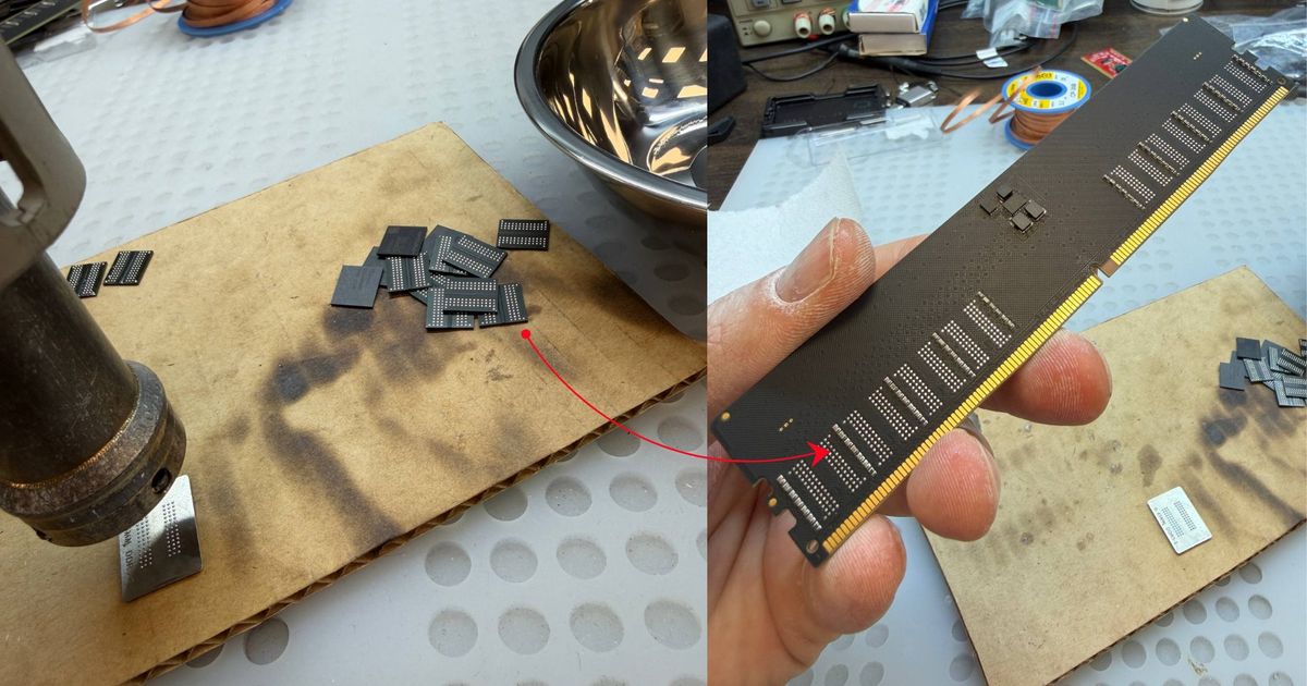 Russian modder VIK-on successfully built functional 32GB DDR5 desktop memory modules using scavenged laptop SO-DIMMs soldered to custom PCBs, achieving 6400 MT/s speeds with XMP support at 40% lower cost than retail equivalents.